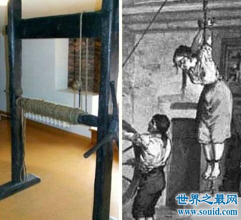 拉肢架被视为一种相对“仁慈”的刑具,被广泛用于过去的审问。行刑时,犯人的手臂被绑在背后,而后用绳索绑住手腕,最后再用绞盘拉动绳索。犯人就这样被吊在半空中,他们能做的除了招供就是继续忍受痛苦。毫无疑问,拉肢是一种吊刑。