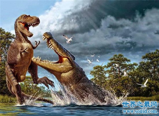 帝鳄(属名Sarcosuchus)又称为肌鳄、帝王鳄,意思为“肌肉鳄鱼”,是一种已灭绝的鳄类。帝鳄生活在约1.1亿年前的白垩纪早期,是曾在地球上生活过的体形最大的鳄鱼之一,其成年个体的体长可以达到13米,完全可以和那些兽脚类恐龙相媲美!不仅如此,帝鳄的嗅觉异常灵敏,即使在水中也能闻到猎物的气味,再加上那长达1.8米、布满利齿的巨口,就是一只小型恐龙转瞬间也会成为它的口中之物。