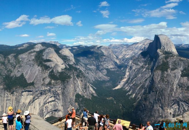 优胜美地公认的地质特征,半圆顶近乎垂直的北坡,已经吸引了超过一个世纪的攀岩者,但无畏的游客也可以从优胜美地山谷的另一侧,一段漫长而艰苦的小径到达山顶,这条小径的最后一段有两条电缆扶手,为陡峭的爬山提供支持。