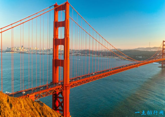 金门大桥是横跨金门、旧金山和马林县之间的一座悬索桥,这座桥花了四年时间建造,于1937年竣工,金门大桥建成后是世界上最长的悬索桥,并已成为国际公认的旧金山和加利福尼亚的象征,桥的红橙色,是被特别选择,使桥更容易透过厚重的雾轻易看到。