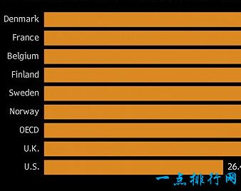 丹麦是一个主权国家,目前在北欧,并被列为税率最高的10个国家之一。这个国家的最高税率为55.56%,因为人们的收入至少为7.6万美元。2008年,所得税税率远高于2013年的62.3%。政府还对股息收入征收28%的税,资本收益为42%,甚至教会也要缴纳0.4%到1.5%的税。超过门槛的礼物也要缴纳15%的税。在全球幸福的研究中,它经常被评为世界上最幸福的国家。