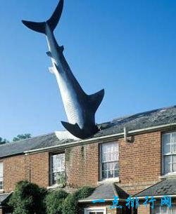 高达8米(25英尺)的玻璃钢海丁顿鲨鱼很难错过,不仅因为它的长度,而且更是如此,因为它似乎正在坠入一个舒适的英国房屋的屋顶。1986年8月9日,长崎爆炸四十一周年之际,房主将屋顶上的鲨鱼置于房屋屋顶上,作为关于使用核武器造成的破坏的声明。当地的邻里议会对这个奇怪的利维坦人并不感到兴奋,并试图把它移除。然而,房主成功地向英国环境部长代表鲨鱼呼吁,并将其免于被劫持。来自世界各地的游客每年都要到新高街看鲨鱼。许多人来庆祝鲨鱼的生日。供应饮料和蛋糕,家庭主人签名他的书“狩猎之鲨”。家里(鲨鱼附着)在2014年上涨租金,每月只有2000多英镑。业主喜欢租住那些不介意游客拍摄鲨鱼的人,谁不介意回答有关其意义的偶尔的问题。不过,讽刺的是,他只要求只有没有宠物的租户才能查询。