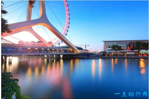 天津之眼,全称天津永乐桥摩天轮,坐落在天津海河畔,是一座跨河建设、桥轮合一的摩天轮,兼具观光和交通功用。是世界上唯一建在桥上的摩天轮,是天津的地标之一。摩天轮直径为110米,轮外装挂64个360度透明座舱,每个座舱可乘坐8个人,可同时供512个人观光。摩天轮旋转一周所需时间为30分钟,到达最高处时,周边景色一览无余,甚至能看到方圆40公里以内的景致,被誉为“天津之眼”。它是一座巨大的观摩天轮,实际上是一座桥的一部分!有什么不喜欢的呢?