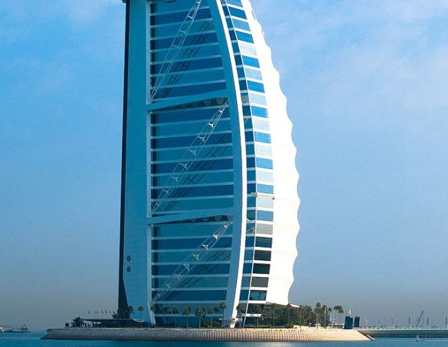 阿拉伯塔酒店位于迪拜,是世界上最豪华的酒店之一。它位于朱美拉海滩280米的人工岛上,通过一座私人弯曲的桥与大陆相连,这个结构的形状是为了模仿船帆而设计的。
