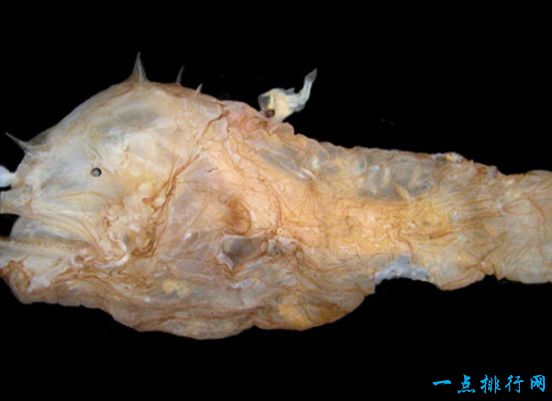 这条长30厘米,满是胶状物质组成的丑陋的鱼,在深600到1200米的海底深渊中发现的。它奇特的外表来自于深处的压力,是表面的100倍,其特殊的构造可以让它在海里漂浮而不消耗能量。其实这张图片还没有展现它的原始形态,鱼从深海到浅水域,经过了减压。