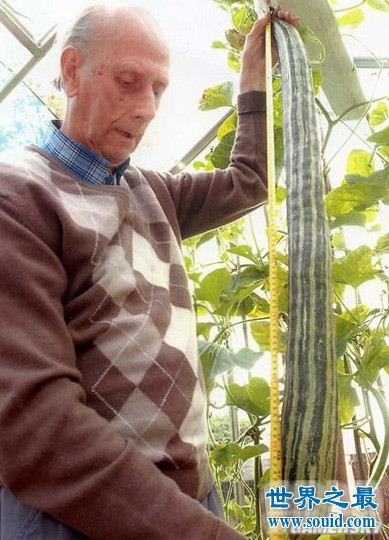 78岁的英国老太太皮尔斯夫人很可能在《吉尼斯世界纪录大全》中留名,因为她种植了一根“世界上最长的黄瓜”。上图中这跟超级大黄瓜从一端到另一端,长度为1.19米;要是再算上弯曲的部分,它的总长度甚至达到了1.3米。而目前在册的最长黄瓜纪录为1.047米,同样是由一名英国人在两年前创下的。