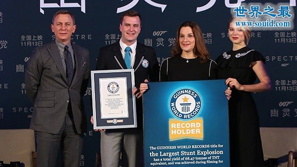 于2015年6月29日在摩洛哥拍摄的一场爆破戏中,电影《007:幽灵党》特效总监克里斯•科博尔德动用了8,418升燃料和33公斤炸药成功完成一场规模宏大的电影特技爆破。这位来自英国的特效师一直以操刀商业大片中的动作戏和特效场景出名,代表作包括《超人》和《蝙蝠侠》等超级英雄电影。活动现场,《007:幽灵党》制片人芭芭拉•布洛柯里、主演丹尼尔•克雷格与蕾雅•赛杜也代表他领取了这项世界纪录的证书。