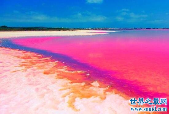 西澳大利亚州的希勒湖呈现美丽的粉红色,这主要是因为湖中藻类产生丰富的β-胡萝卜素,使湖水的盐性大,而且略带著明亮的粉红色。该湖也很浅,只有约1米深。但这只是过去的认为了。