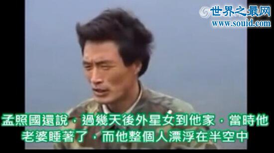 他表示当时老婆孩子则静静的躺在床上,他自己却漂浮在上方,然后与那位女性进行了40分钟左右的亲密接触。亲密接触结束后女性离开,而孟照国的大腿处出现5厘米长的疤痕。一个月后他穿墙走进太空船遇到了外星人。他问起是否能再见到之前那名女性,得到的回答是否定的。不过外星人表示,60年之内,一个中国农民的后代将诞生在其他星球上。他们同时表示孟照国有机会去看自己的孩子。